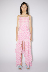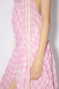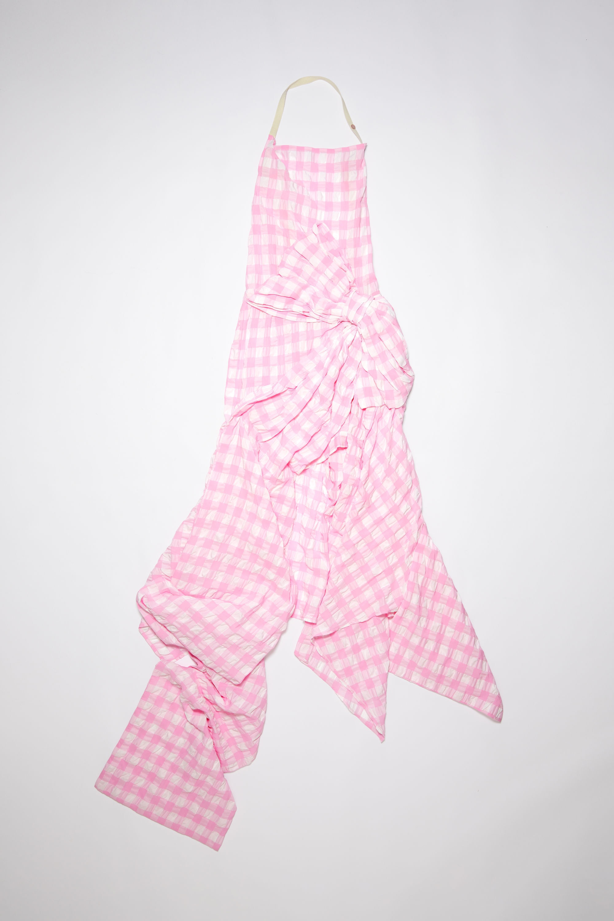 Acne Studios pink dress features an all-over gingham pattern, adorned with a bow, an adjustable neck strap and an open back with a tie-up detailing. Cut to a relaxed fit with a mid thigh to knee asymmetric length and a draped hem. - Relaxed fit - Mid thigh to knee length - Draped hem - Open back - Decorative bow - Adjustable neck strap - Discrete back zip closure - Model is 177 cm / 5'8 and wears a size 36 - Style ID: FN-WN-DRES000912 - Shell: 50% Polyester, 50% Viscose