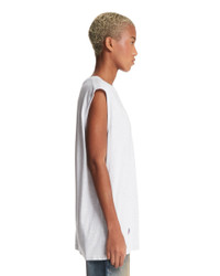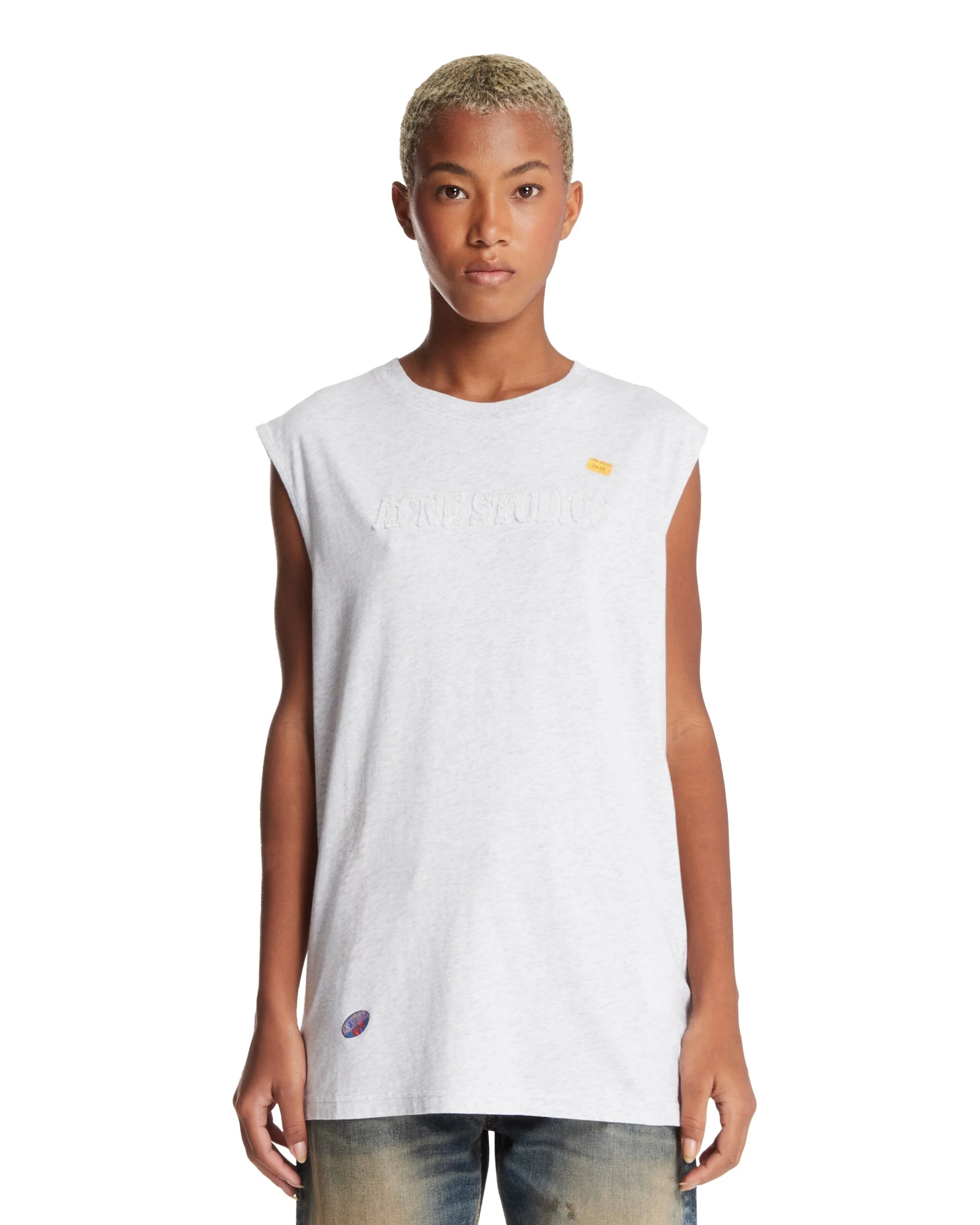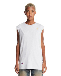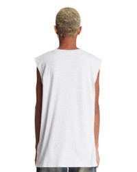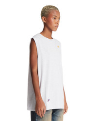 Acne Studios Gray Logo-Embossed Top. Gray cotton, embossed logo on the front panel, sleeveless, straight hem. Multicolored details on the front panel, relaxed fit. Carol is 178 cm and she is wearing size S. DETAILS Model: CL0350990 Composition: 100% Cotton Made in: PORTUGAL Season: FW25-26