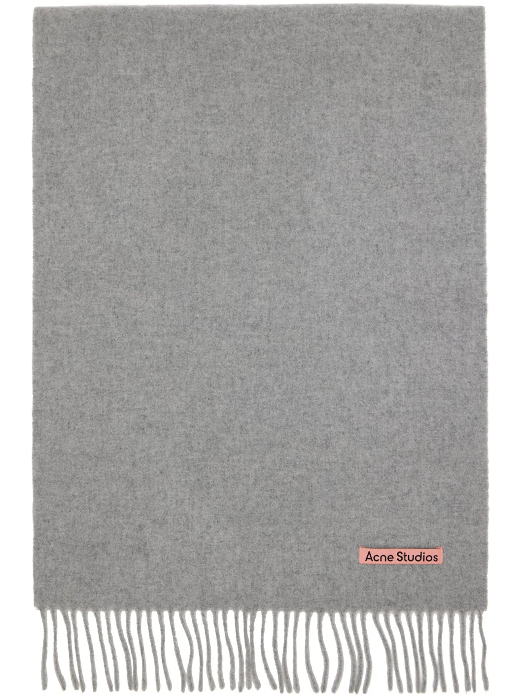 Rectangular RWS-certified wool flannel scarf. · Logo patch at face · Fringed detailing at ends · L86.5" x W17.75" Supplier color: Light grey melange 100% wool. Made in Italy 252129F028033
