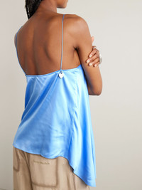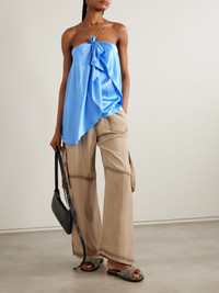 Acne Studios' top is made from lustrous satin in a pretty blue. It has pin-thin halter straps and gathers at the neck, falling to softly draped ruffles through the front. Size & Fit - EU 32 = UK 4/ US 0/ FR 34/ IT 38 - EU 34 = UK 6/ US 2/ FR 36/ IT 40 - EU 36 = UK 8/ US 4/ FR 38/ IT 42 - EU 38 = UK 10/ US 6/ FR 40/ IT 44 - EU 40 = UK 12/ US 8/ FR 42/ IT 46 - EU 42 = UK 14/ US 10/ FR 44/ IT 48 - Fits true to size, take your normal size - Cut to be fitted at the bust, loose at the waist and hip - Lightweight, non-stretchy fabric - Model is 180cm/ 5'11" and is wearing an EU 34 Model measurements: - Bust: 80cm/ 31.5" - Waist: 65cm/ 25.5" - Hip: 89cm/ 35" Details & Care - Blue satin - Concealed hook and zip fastening at side - 97% viscose, 3% elastane - Dry clean
