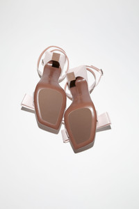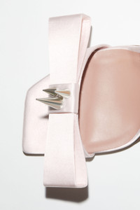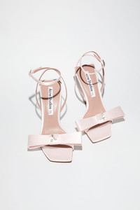 Acne Studios pink high-heel sandal shoes feature a satin fabric, adorned with a bow and stud details. Complete with a buckle strap closure. - Sandal high heel - Strap buckle closure - Satin fabric - Bow detail on the front - Studded details - Heel measurement: 11 cm - Style ID: FN-WN-SHOE000756 - Uppers: 97% Polyester, 3% Elastane, Lining: 97% Polyester, 3% Elastane, Soles: 70% Cow leather, 30% Rubber