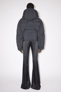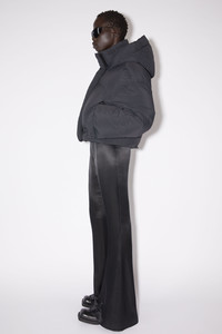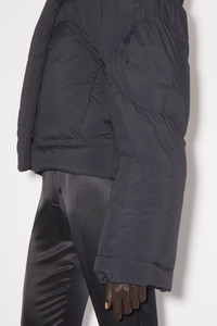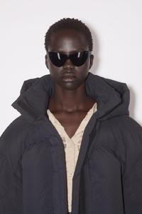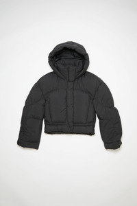 Acne Studios black hooded puffer jacket features a zipper closure, side pockets, and an embroidered Acne Studios logo at the neckline. Cut to a relaxed fit with a funnel neckline and below waist length. - Relaxed fit - Below waist length - Funnel neck and hood - Zipper closure - Zipper pockets - Embroidered Acne Studios logo - Fully lined - Model is 179 cm / 5′11 and wears a size 36 - Style ID: FN-WN-OUTW000814 - Filling made from recycled down and recycled feathers. Lining made from recycled nylon. - Shell: 100% Nylon, Lining: 100% Nylon, Filling: