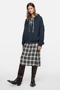 Hooded sweater crafted from soft cotton fleece, featuring a seasonal denim-inspired rivet logo print on the back and distressed details throughout. Cut to a regular unisex fit and hip length. - Regular fit - Hip length - Hooded - Logo print on back - Distressed details - Side seam pockets - Ribbed cuffs and hem - One-way zipper closure - Female model is 178 cm / 5′8 and wears a size XS - Male model is 187 cm / 6'1 and wears a size M - Style ID: FN-UX-SWEA000106 - Made with organic cotton and recycled polyester. - Shell: 15% Polyester, 85% Cotton