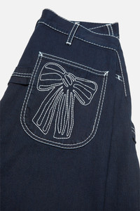 Five-pocket trousers in woven indigo denim with seasonal bow embroidery on the back pocket. Finished with a zip fly, hammer loop, and cut to a regular fit with mid waist and regular length. - Regular unisex fit - Mid-waist - Regular length - Embroidered seasonal bow artwork - Female model is 177 cm / 5'8 and wears a size 36 - Male model is 189 cm / 6'2 and wears a size 46 - Style ID: FN-UX-SHOR000041 - Made from organically grown cotton - Shell: 100% Cotton