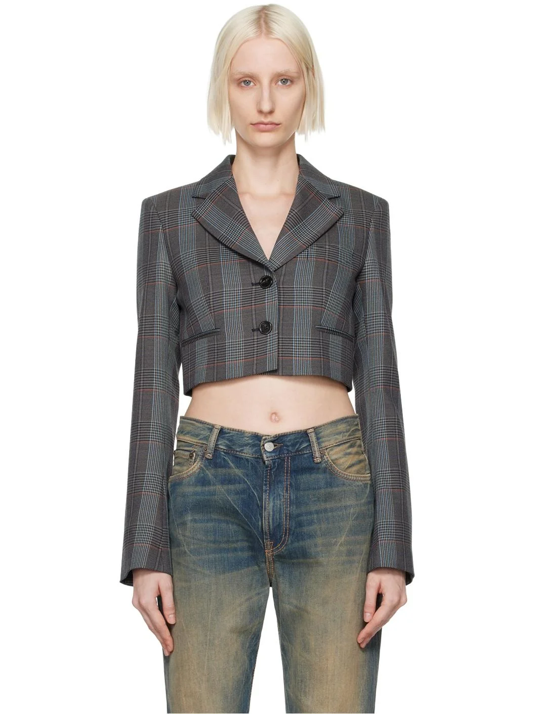 Wool- and polyester-blend flannel blazer. Glen check pattern throughout. · Notched lapel · Two-button closure · Welt pockets · Cropped hem · Padded shoulders · Four-button surgeon's cuffs · Full satin lining Supplier color: Gray melange Body: 51% wool, 49% polyester. Lining: 100% viscose. Made in Portugal 242129F057008