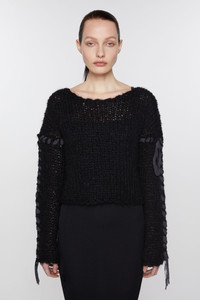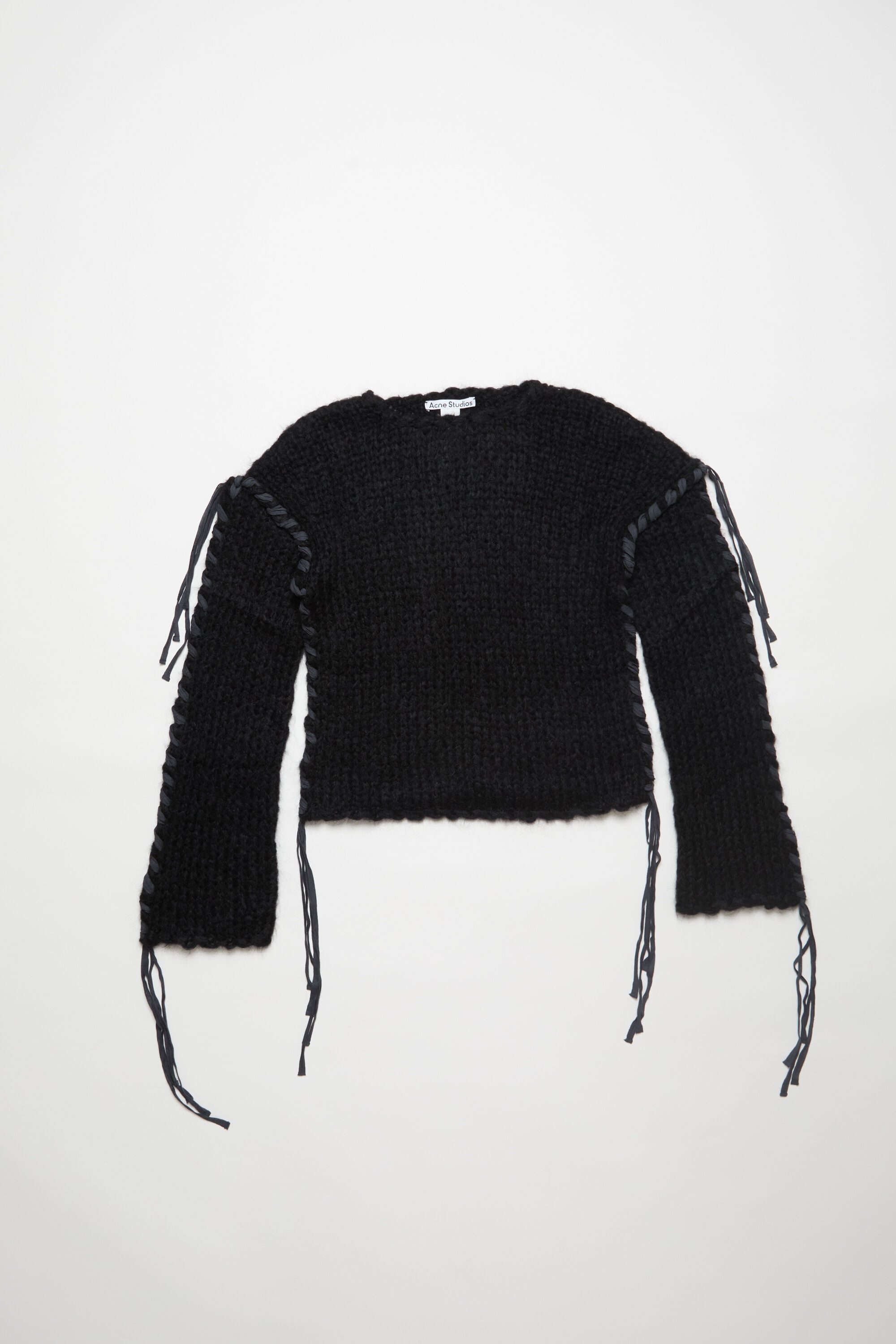 Crew neck jumper is crafted from a hand-knitted wool and mohair blend with a loose-knit finish. Adorned with lace-up detailing across the side of the body and sleeves. Cut to a relaxed fit with dropped shoulders and waist length. - Relaxed fit - Dropped shoulders - Waist length - Hand-knitted loose knit - Lacing details - Semi-sheer finish - Model is 180cm/ 5'11 and wears a size S - Style ID: FN-WN-KNIT000761 - Shell: 44% Nylon, 32% Wool, 24% Mohair, Contrast: 100% Cotton