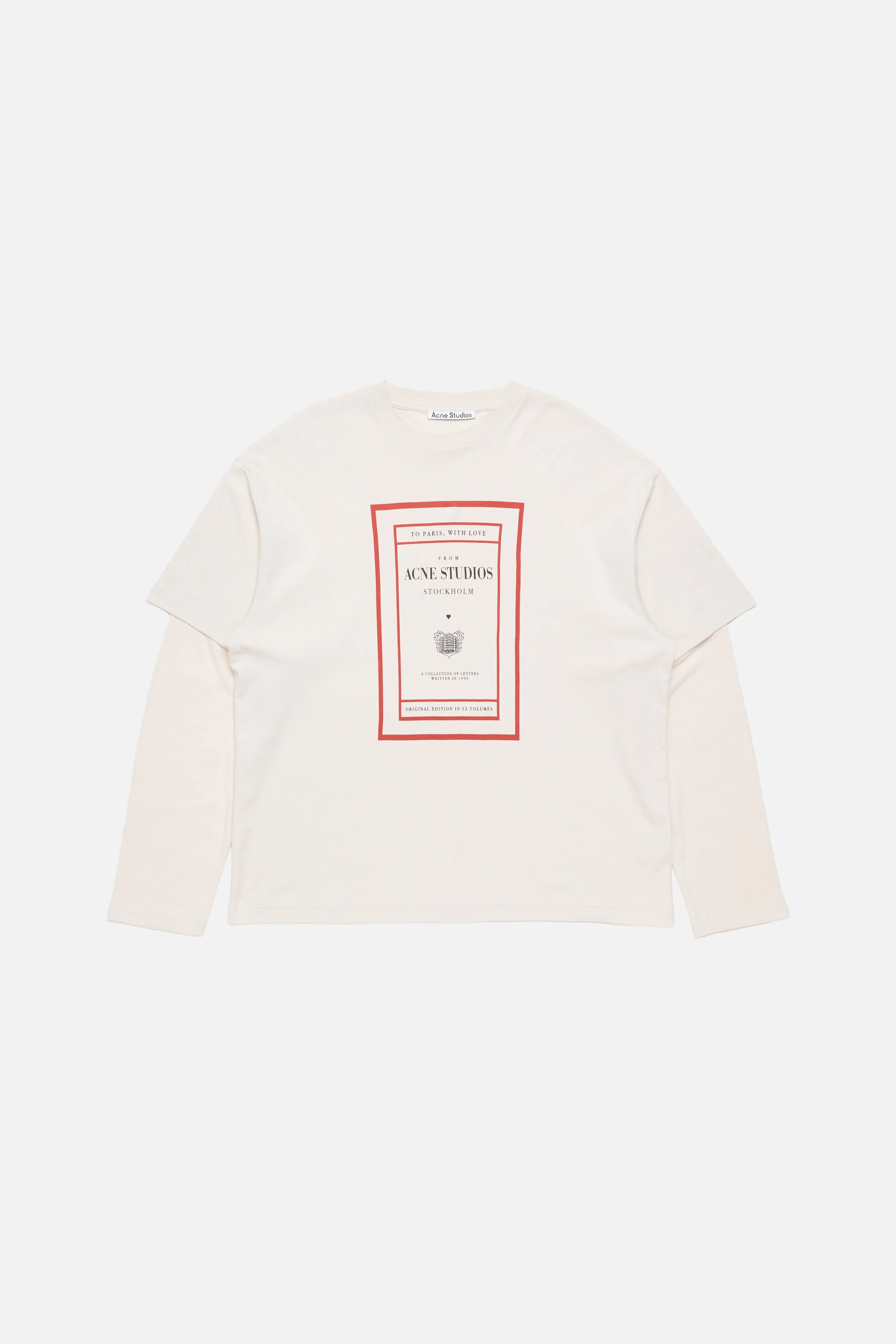 Long-sleeve crewneck T-shirt with layered construction, crafted from soft cotton jersey with a vintage feel and ribbed sleeves. Features a seasonal graphic print on the front chest and is cut to a relaxed unisex fit with a hip-length silhouette. - Crewneck T-shirt - Soft cotton jersey with vintage feel; ribbed sleeves - Relaxed fit - Hip-length - Long sleeves - Layered construction - Seasonal graphic print - Model is 178 cm / 5'10 and wears a S - Style ID: RW-WN-TSHI000023 - Shell: 100% Cotton, Contrast: 82% Viscose, 18% Nylon