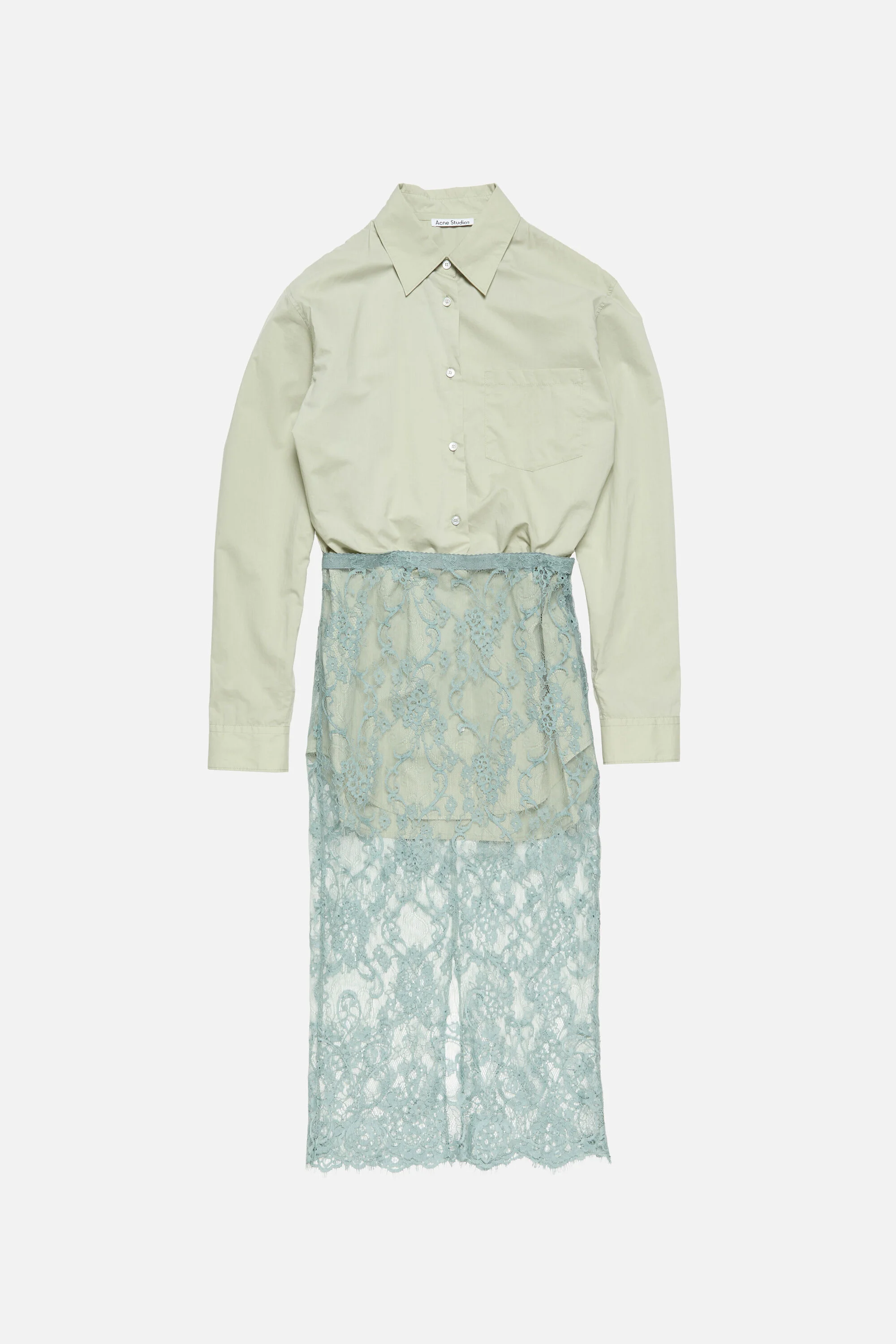 Shirt dress with a layered construction featuring a tailored shirt layer and a sheer lace skirt with a gathered waist. Complete with a back slit and an invisible zip closure. Cut to a regular fit with relaxed sleeves, a mid waist, and a mid-calf length. - Regular fit - Mid waist - Mid-calf length - Layered construction - Tailored shirt layer - Sheer lace skirt - Gathered waist - Back slit - Invisible zip closure - Model is 177 cm / 5'10 and wears a 36 - Style ID: RW-WN-DRES000013 - Contrast: 60% Cotton, 40% Nylon, Shell: 21% Silk, 79% Cotton
