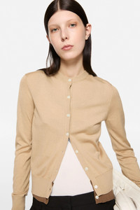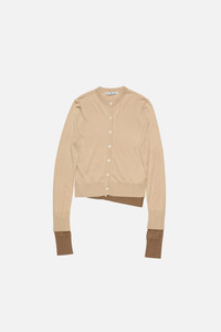 Layered cardigan crafted from lightweight silk knit. Features a double-layered construction and a button-up closure. Finished with a logo patch at the back neckline. Cut for a regular fit and a below-the-waist silhouette. - Regular fit - Silk blend - Below waist length - Button-up closure - Logo patch on back - Model is 180 cm/ 5'9 and wears a size S - Style ID: FN-WN-KNIT000869 - Made with certified wool according to the Responsible Wool Standard - Shell: 70% Silk, 10% Cashmere, 20% Wool
