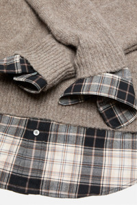 Hooded knit sweater with a layered construction, crafted from soft, mid-weight yak-blend yarn with a minimalist finish. Features woven flannel shirting details at the hem and cuffs. Designed with dropped shoulders and cut to a relaxed fit with a below-hip length. - Relaxed fit - Below-hip length - Hooded - Flannel shirting details - Model is 179 cm / 5'9 and wears a size S - Style ID: FN-WN-KNIT000891 - Shell: 31% Yak wool, 22% Nylon, 16% Wool, 31% Alpaca, Contrast: 100% Cotton