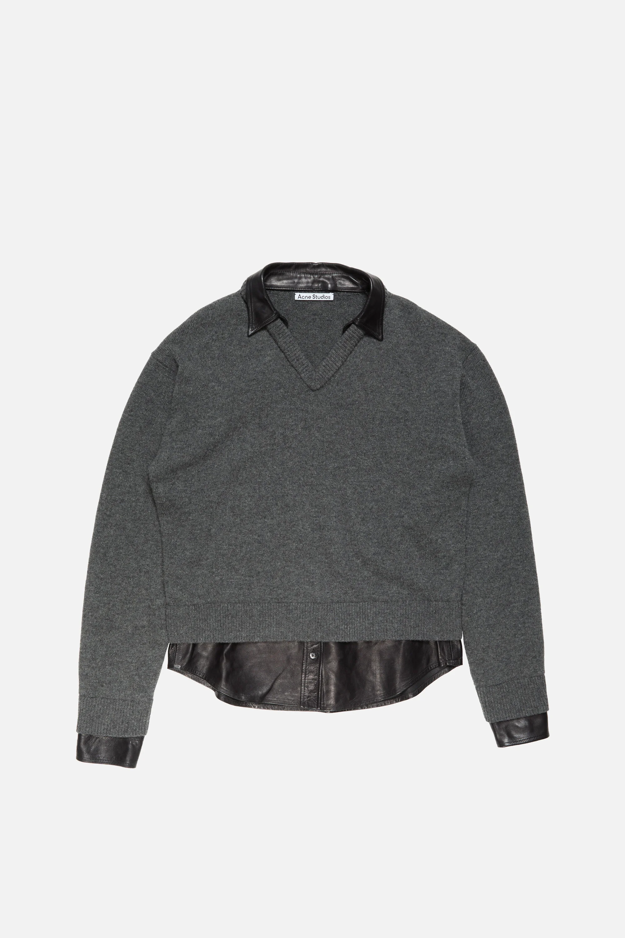 V-neck sweater with a layered construction, crafted from wool with a leather collar and shirting underlayer. Complete with a branded rivet on back neckline. Cut to a relaxed fit and hip length. - V-neck sweater - Relaxed fit - Hip length - Layered construction - Leather collar - Shirting under-layer - Branded rivet - Model is 180 cm / 5'9 and wears a size S - Style ID: RW-WN-KNIT000001 - Shell: 100% Wool, Contrast: 100% Lamb leather