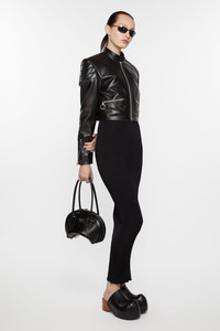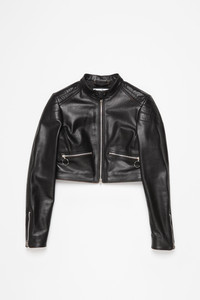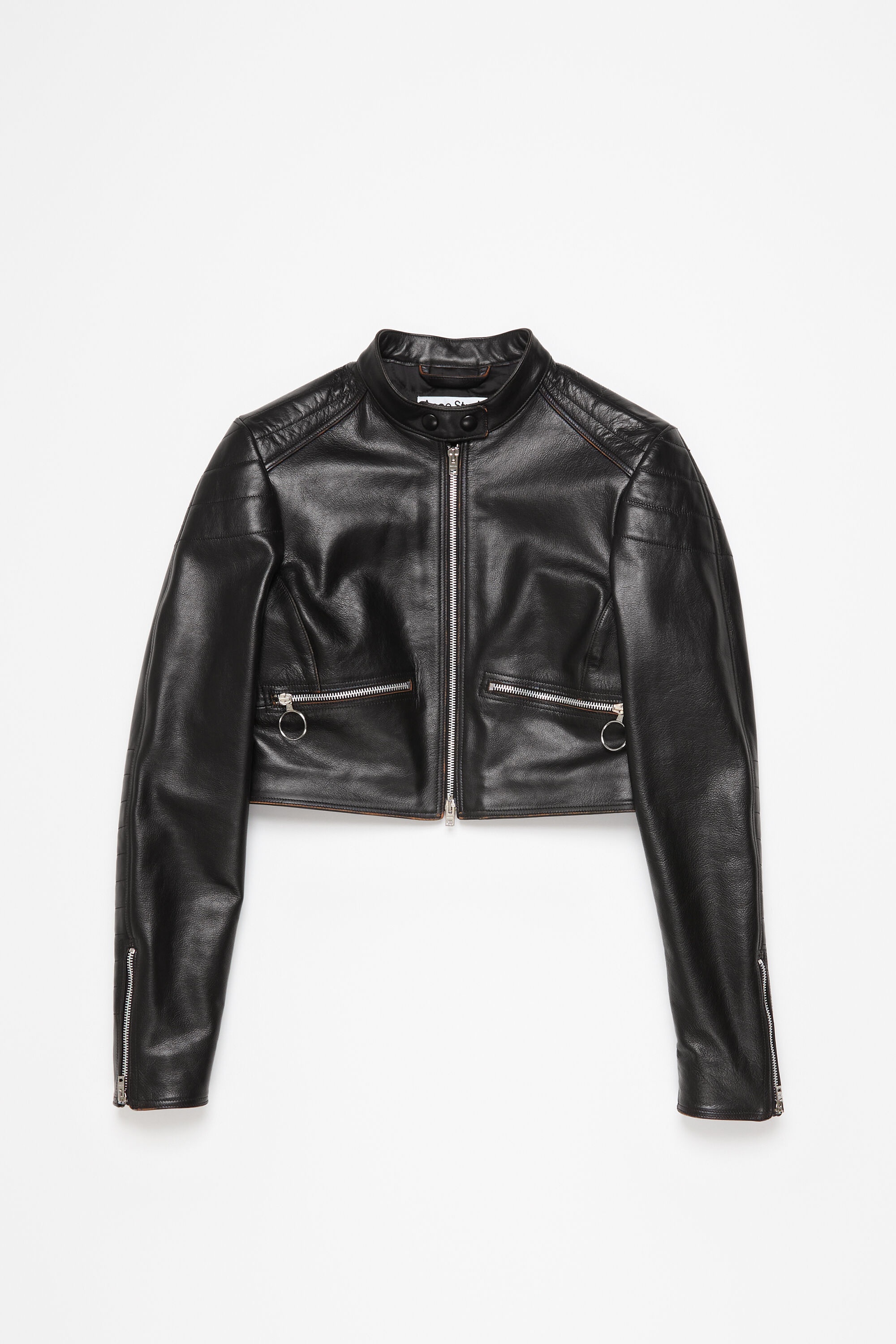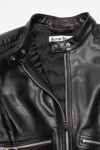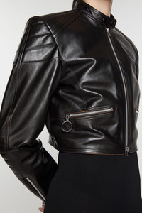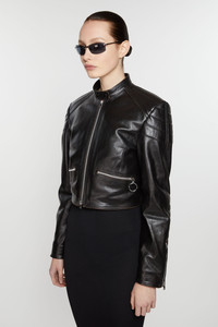 Biker jacket is crafted from leather with topstitching details and padding on the sleeves and shoulders. Complete with stand buttoned collar and silver-toned 2-way front zipper closure. Cut to a fitted fit and a cropped waist length. - Fitted fit - Below waist length - Padded shoulders - Button stand collar - 2-way zipper closure - Zipper pockets - Fully lined - Model is 180cm/ 5'11 and wears a size 36 - Style ID: FN-WN-LEAT000379 - Shell: 100% Cow leather, Lining: 100% Preferred viscose