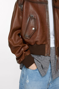 Leather bomber jacket is crafted from soft leather with a treated finish with a garment-dyed effect at the seams. Detailed with a centre front zipper closure front pockets. Complete with a ribbed elasticated hem and cuffs. Cut to a relaxed fit and hip length. - Relaxed fit - Hip length - Garment dyed leather - Zipper closure - Ribbed gem and cuffs - Front pockets - Fully lined - Model is 177 cm / 5'10 and wears a size 36 - Style ID: FN-WN-LEAT000424 - Shell: 100% Preferred lamb leather, Lining: 100% Preferred viscose