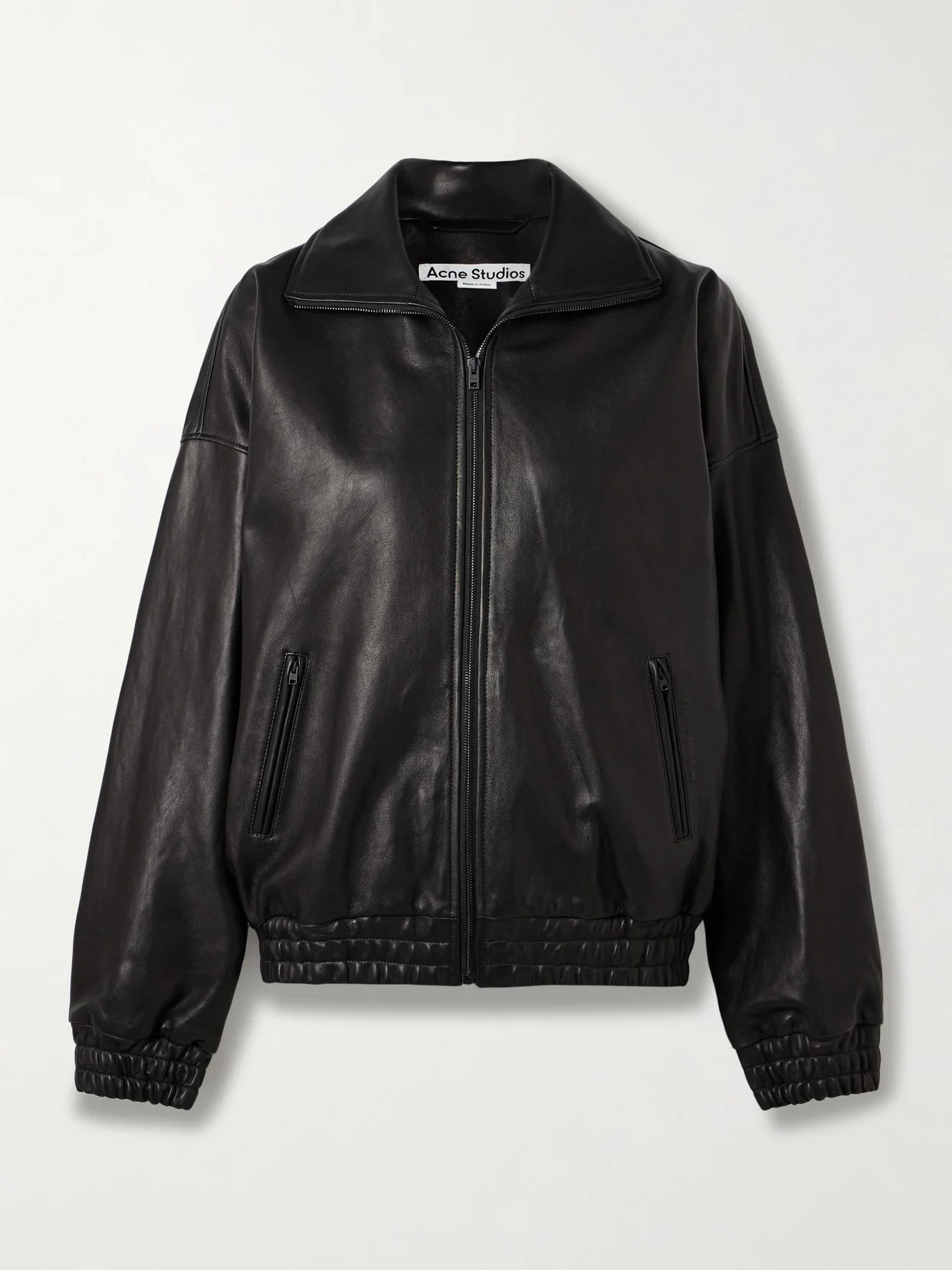 Bomber jackets are a must-have in any well-curated wardrobe, so you'll want to invest in a quality style like Acne Studios'. Made from smooth black leather, it has an oversized shape cinched by elasticated trims and a smooth satin-jacquard lining.