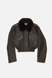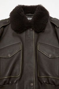 Bomber jacket crafted from soft lamb leather with a shearling collar and dropped shoulders featuring epaulettes. Complete with front flap pockets, side welt pockets, an elasticated hem, and front snap button and zipper closure. Finished with zip sleeves and a metal logo plaque at the back neckline. Cut to a relaxed fit and below-waist length. - Bomber jacket - Relaxed fit - Below-waist length - Shearling collar - Epaulettes - Front flap pockets - Side welt pockets - Elasticated hem - Front snap button and zipper closure - Metal logo plaque - Model is 179 cm and wears a size 36 - Style ID: FN-WN-LEAT000502 - Uppers made from leather from a Leather Working Group (LWG) certified tannery with Gold rating - Shell: 100% Lamb leather, Contrast: 100% Lamb shearling, Lining: 100% Viscose