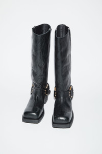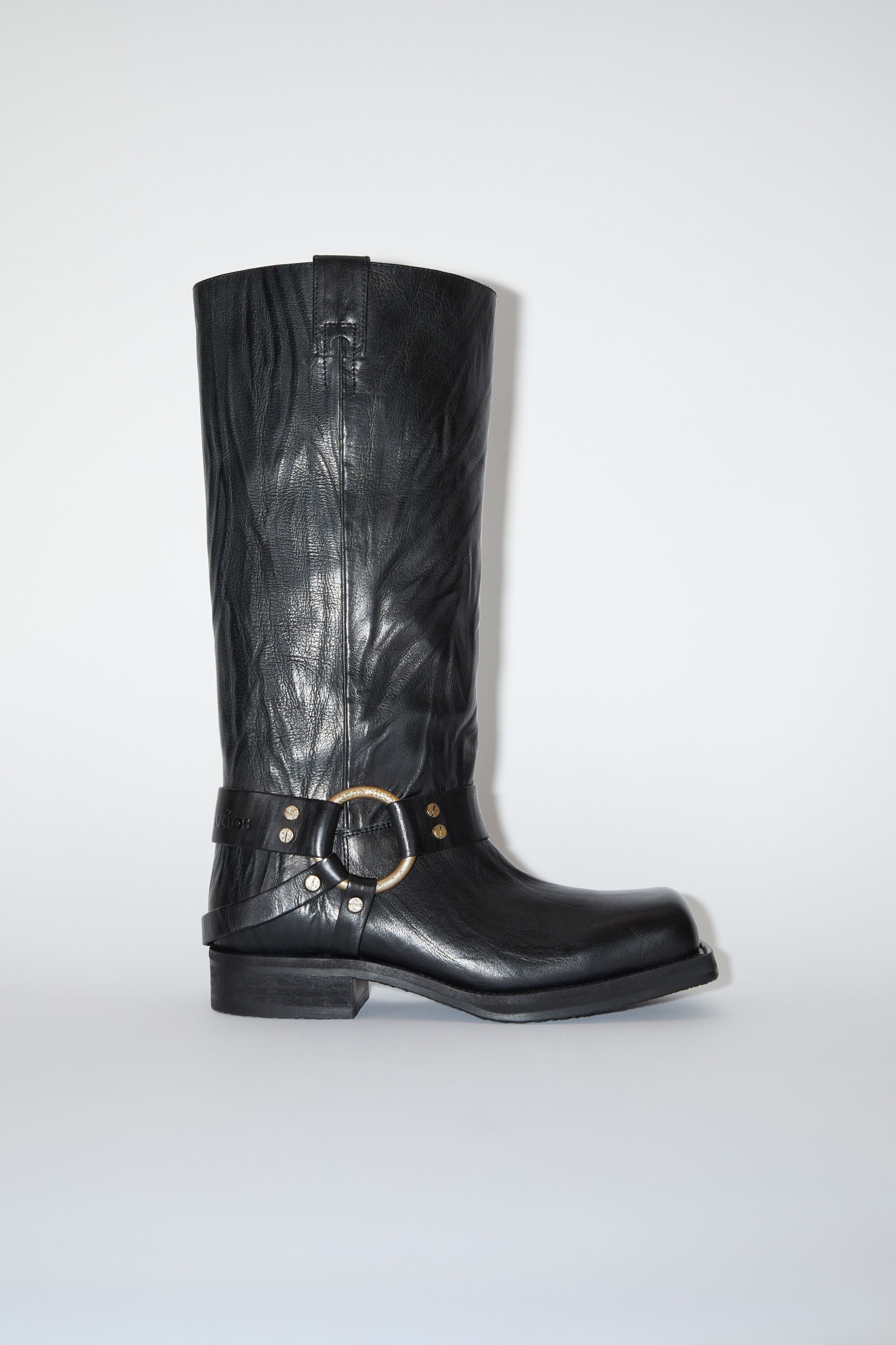 Acne Studios black boots are crafted from leather with a crinkled finish and adorned with metal hardware accents. Complete with stirrup strap details and debossed Acne Studios logo on the back. - Biker-style boots - Square toe - Stirrup details - Debossed Acne Studios logo - Metal hardware - Heel height: 35 mm - Platform height: 20 mm - Made in Italy - Style ID: FN-WN-SHOE000790 - Uppers: 100% Calf leather, Lining: 100% Calf leather, Soles: 100% Rubber