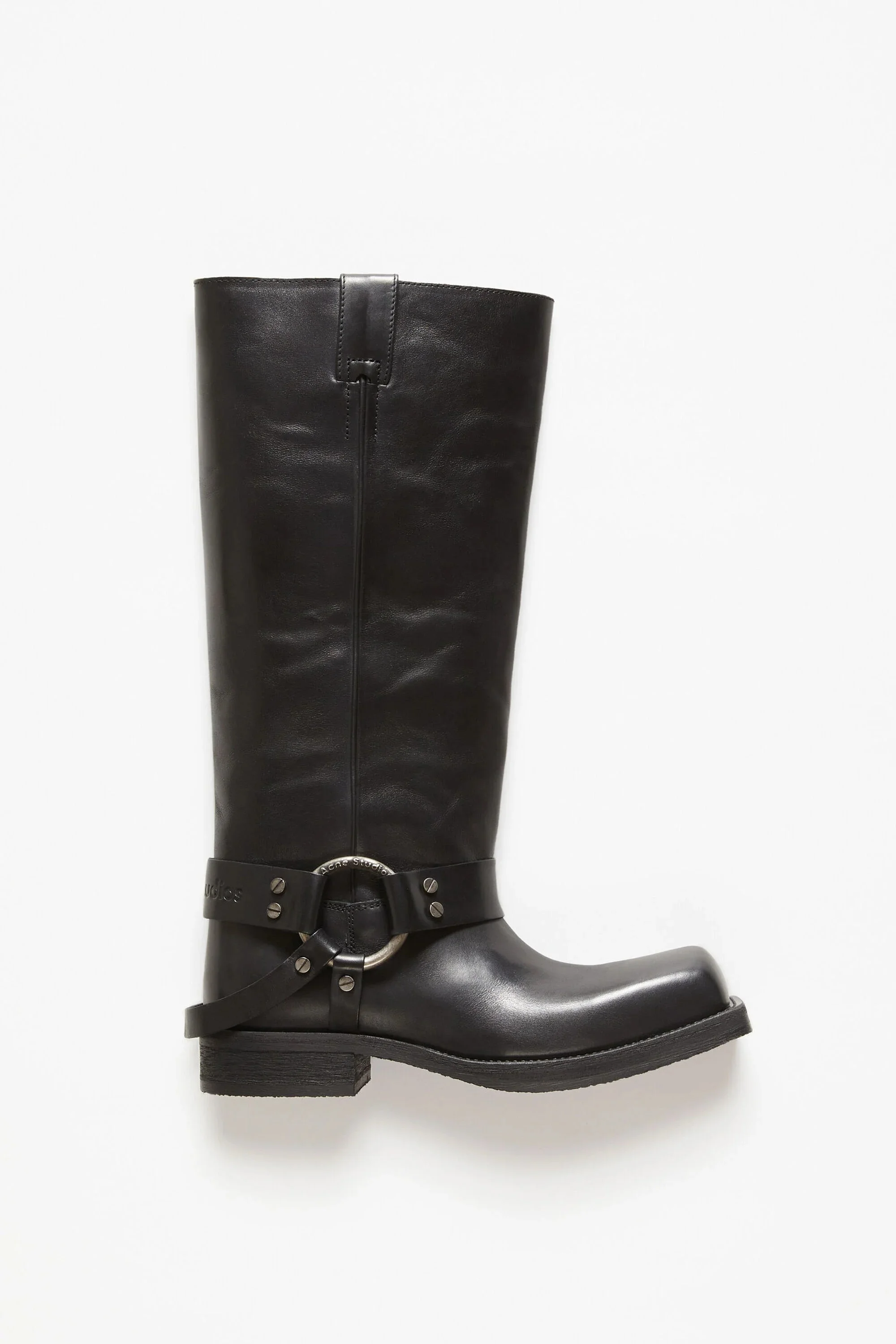 Buckle boots are crafted from leather adorned with biker-inspired metal hardware accent and debossed Acne Studios logo on the back. - Biker-style boots - Square toe - Metal hardware, ring and studs - Debossed Acne Studios logo - Heel height: 35 mm - Sole height: 20 mm - Made in Italy - Style ID: FN-WN-SHOE000789 - Uppers: 100% Preferred calf leather, Lining: 100% Preferred calf leather, Soles: 100% Rubber