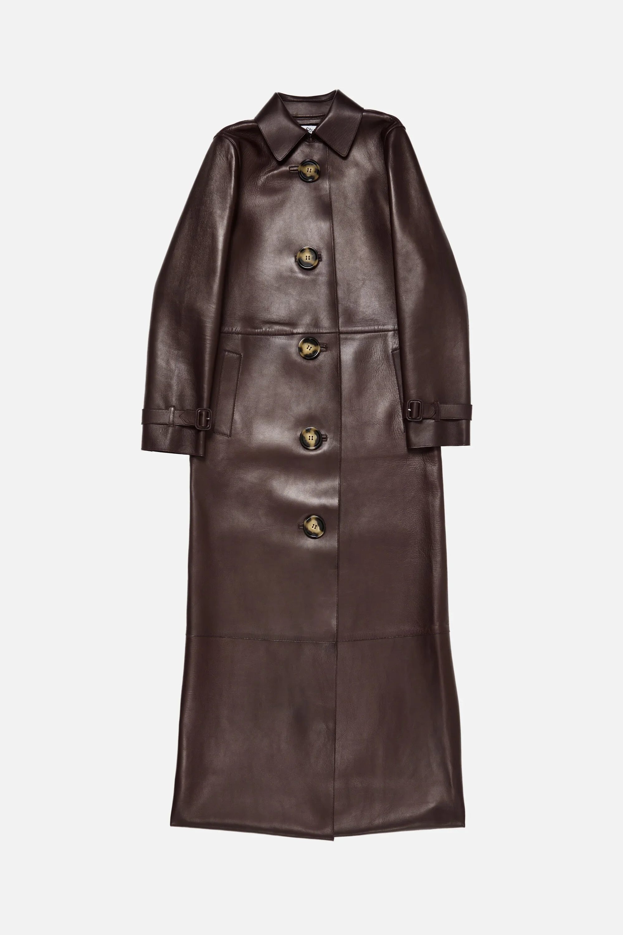 Single-breasted coat crafted from soft leather, featuring a center front button closure and front welt pockets. Detailed with trench-style belt cuffs and a metal Acne Studios logo plaque at the back neckline. Cut to a regular fit with an extra-long length. - Regular fit - Extra-long length - Trench-style belt cuffs - Front button closure - Front welt pockets - Metal Acne Studios logo plaque - Model is 178 cm / 5'8 and wears a size 36 - Style ID: FN-WN-LEAT000462 - Shell: 100% Lamb leather
