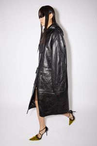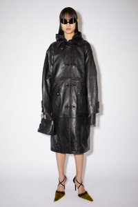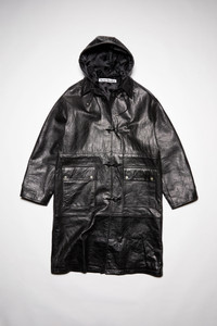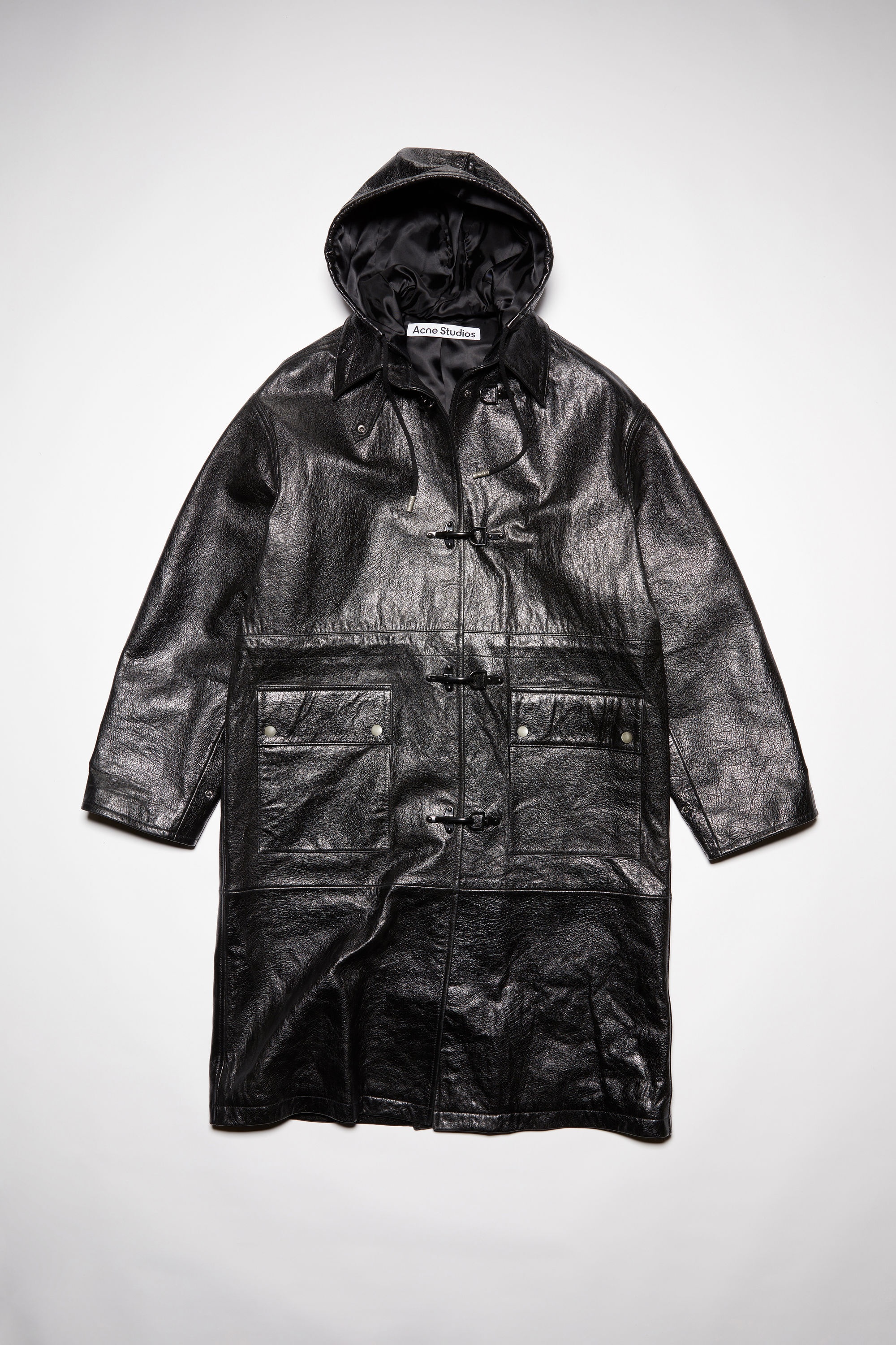 Acne Studios black coat is crafted from leather and features a relaxed silhouette with a long length. Detailed with a hood with drawstrings, patch pockets and hook front closure on the front. - Coated leather - Hooded - Patch pockets with snap closure - Snap and hook front closure - Fully lining - Style ID: FN-WN-LEAT000209 - Relaxed fit - Elongated sleeve length - Under the knee length - European sizing - Model is 180 cm / 5′11″ and wears a size 36 - Shell: 100% Lamb leather, Lining: 100% Viscose