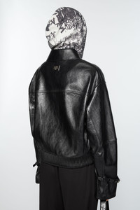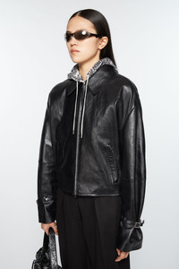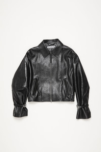 Leather jacket features a 2-way zipper front closure, zipper and belted cuffs. Detailed with an Acne Studios 1996 metal plaque at the centre back neckline and elasticated back hem. Crafted from leather with a drum-dyed finish. Cut to a relaxed fit and hip length. - Relaxed fit - Hip length - Shirt collar - 2-way zipper closure - Zip and belt details - Front zipper pockets - Elasticated waist at the back - Fully lined - Model is 178cm/ 5'10 and wears a size 36 - Style ID: FN-WN-LEAT000385 - Shell: 100% Lamb leather, Lining: 100% Viscose