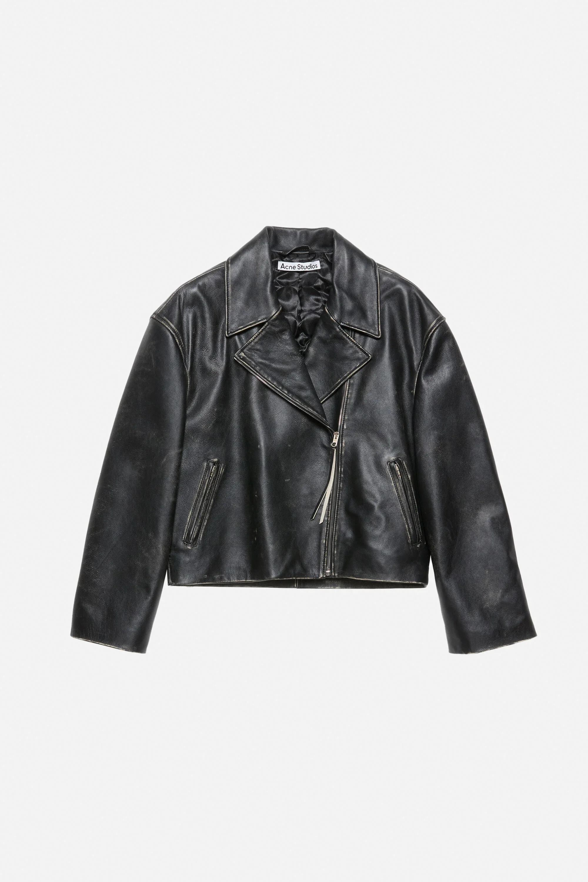 Acne Studios black double-breasted jacket features a biker-style construction with a light padding, crafted from leather with handmade worked-on details and painted effect. Complete with a zippered closure and side jet pockets. Cut to a relaxed fit and regular length. - Relaxed fit - Hip length - Handmade painted details - Zipper front closure - Side zipper pockets - Lightly padded and quilted lined - Model is 178 cm / 5'8 and wears a size 36 - Style ID: FN-WN-LEAT000411 - Shell: 100% Cow leather, Lining: 100% Polyester, Filling: