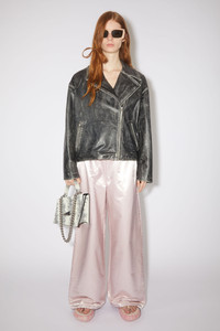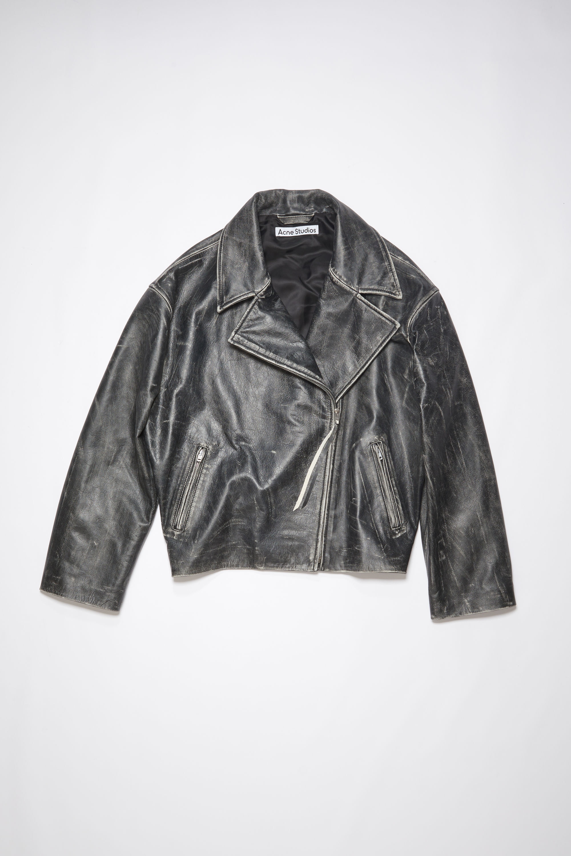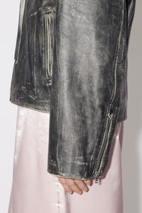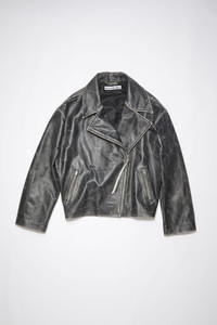 Acne Studios black double-breasted jacket features a biker-style construction with a light padding, crafted from leather with handmade distressed details. Complete with a zippered closure and side jet pockets. Cut to a relaxed fit and regular length. - Relaxed fit - Hip length - Handmade distressed details - Zipper front closure - Side zipper pockets - Lightly padded and quilted lined - Model is 178 cm / 5'8 and wears a size 36 - Style ID: FN-WN-LEAT000236 - Shell: 100% Cow leather, Lining: 100% Viscose