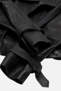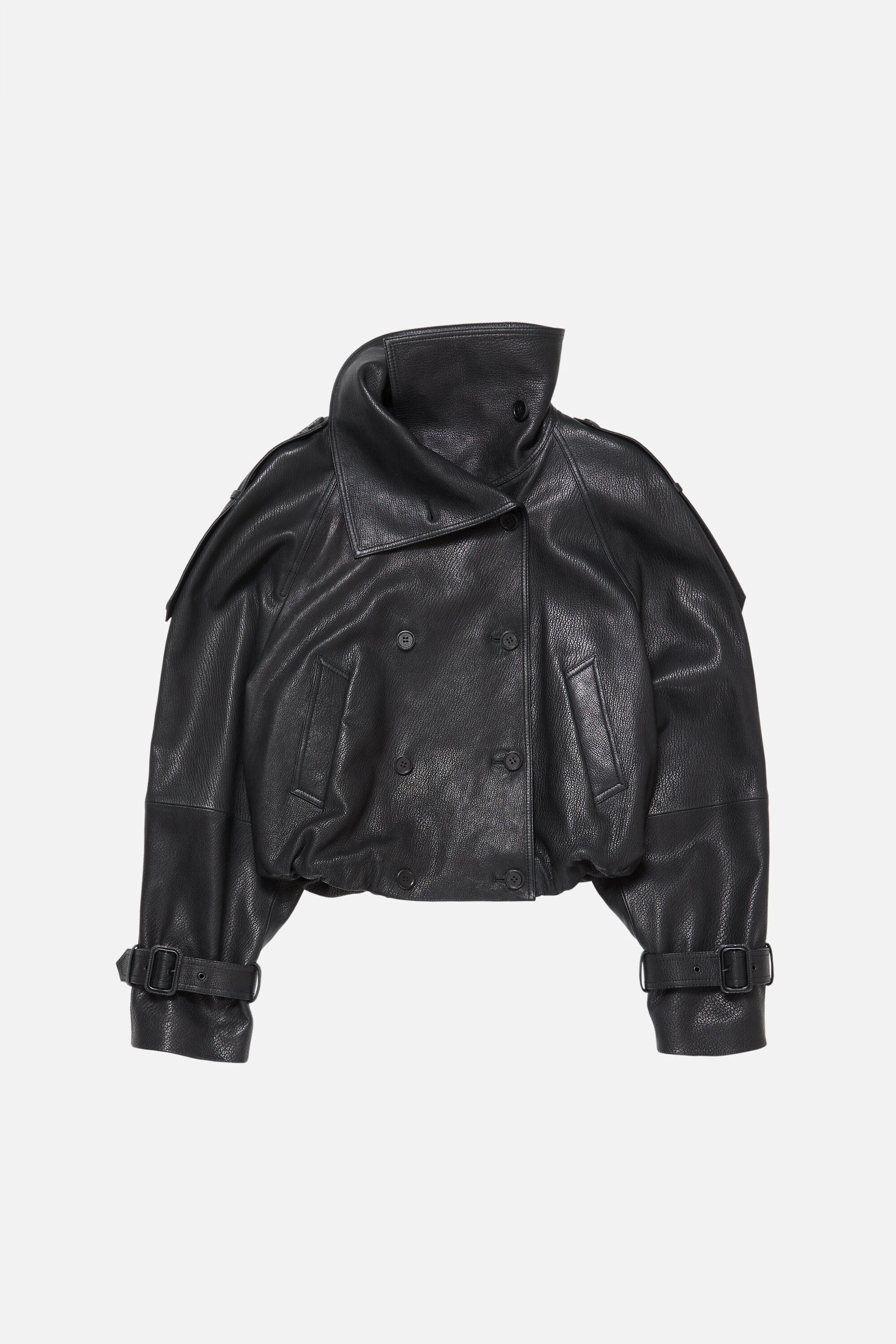 Cropped double-breasted trench coat crafted from full-grain leather, featuring an elongated neckline and an elasticated hem for a gathered effect. Detailed with epaulettes, side pockets, sleeve tabs with buckles, and a leather logo label at the back neckline. Cut to a relaxed fit with relaxed sleeves and a below-waist length. - Trench coat - Relaxed fit - Below-waist length - Elasticated hem - Side pockets - Sleeve tabs - Leather logo label - Model is 177 cm / 5'8 and wears a size 38 - Style ID: FN-WN-LEAT000445 - Shell made from leather from a Leather Working Group (LWG) certified tannery with Gold rating - Shell: 100% Lamb leather, Lining: 100% Viscose