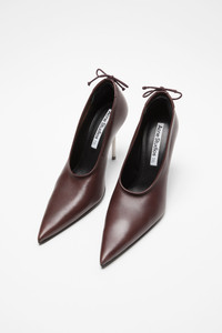 Pump shoe with a pointed toe, crafted from nappa calf leather. Features a cord bow at the back and a ribbed metal heel with a shiny finish. - Pump construction - Pointed toe - Cord bow at back - Ribbed metal heel with a shiny finish - Heel height: 100 mm - Style ID: FN-WN-SHOE001093 - Uppers: 100% Calf leather, Lining: 100% Lamb leather, Soles: 40% Thermoplastic polyurethane, 60% Cow leather