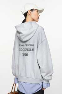 Hooded sweater is cut to a relaxed unisex fit with dropped shoulders and below-hip length. Detailed with an Acne Studios logo stamp print at the back, crafted from a fleece cotton blend with a vintage sprayed effect. - Relaxed unisex fit - Dropped shoulders - Below hip length - Hooded - Sprayed finish - Logo at the back Acne Studios 1996 - Distressed details at the cuffs and hem - Female model is 176 cm / 5′10 and wears a size XS - Male model is 188.5 cm / 6′2 and wears a size M - Style ID: FN-UX-SWEA000023 - Made with organically grown cotton and recycled polyester. - Shell: 89% Organic cotton, 11% Recycled polyester