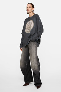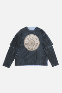 Long-sleeve crewneck t-shirt with a layered construction, crafted from soft cotton jersey. Features a seasonal denim-inspired rivet logo print on the front and distressed details throughout. Cut to a relaxed unisex fit and hip length. - Relaxed fit - Hip length - Layered long sleeves - Logo print on front - Distressed details - Female model is 176 cm / 5'7 and wears a size XS - Male model is 187 cm / 6'1 and wears a size M - Style ID: FN-UX-TSHI000156 - Made with organically grown cotton and recycled polyester - Shell: 75% Cotton, 25% Polyester, Contrast: 75% Cotton, 25% Polyester