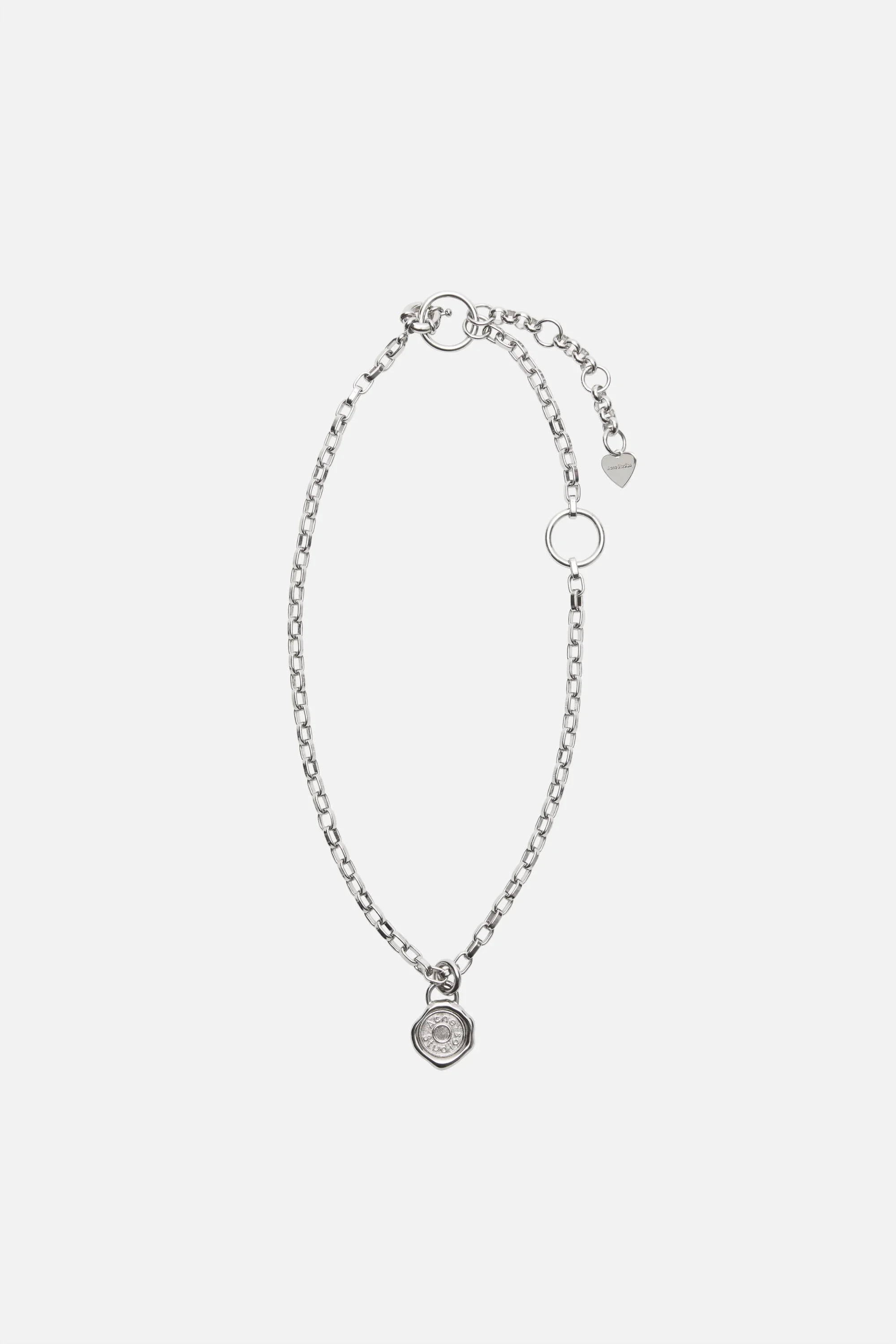 Charm necklace featuring a logo-stamp pendant engraved with a denim rivet-inspired Acne Studios logo. Crafted from brass with a silver finish and completed with a dogclip closure. - Charm necklace - Logo-stamp pendant - Engraved Acne Studios logo - Dogclip closure - Chain total length: 510 mm - Adjustable closure: 40 mm - Style ID: AC-WN-JEWE000002 - Shell: 100% Brass