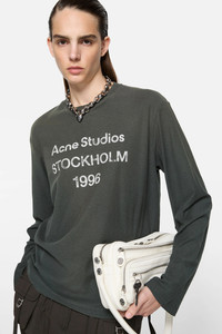 Long sleeve t-shirt is cut to a relaxed unisex fit and hip length. Detailed with an Acne Studios 1996 stamp logo, distressed neckline, cuffs and hem. Crafted from cotton with a sprayed finish. - Relaxed unisex fit - Hip length - Crew neck - Sprayed finish - Stamp logo 'Acne Studios Stockholm 1996' - Distressed neckline, cuffs and hem - The female model is 180 cm / 5’11” and wears a size S - The male model is 188 cm / 6′2″ and wears a size M - Style ID: FN-UX-TSHI000016 - Made from organically grown cotton. - Shell: 85% Organic cotton, 15% True hemp