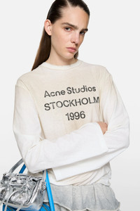 Long sleeve t-shirt is cut to a relaxed unisex fit and hip length. Detailed with an Acne Studios 1996 stamp logo, distressed neckline, cuffs and hem. Crafted from cotton with a sprayed finish. - Relaxed unisex fit - Hip length - Crew neck - Sprayed finish - Stamp logo 'Acne Studios Stockholm 1996' - Distressed neckline, cuffs and hem - The female model is 180 cm / 5’11” and wears a size S - The male model is 183 cm / 6′ and wears a size M - Style ID: FN-UX-TSHI000016 - Made from organically grown cotton. - Shell: 85% Organic cotton, 15% True hemp