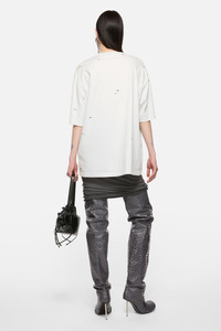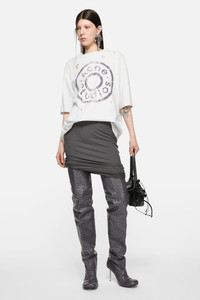 Unisex T-shirt made from 1:1 ribbed fabric in a melange color, featuring a soft-hand screen print. Treated for an authentically worn look with all-over breakage, giving each garment a unique appearance. Designed with a relaxed fit and hip-length cut. - Unisex t-shirt - Relaxed fit - Hip length - Ribbed melange - Screenprint logo - Distressed details - Female model is 180 cm / 5'9" and wearing a size XS - Make model is 186 cm / 6'1" and wearing a size M - Style ID: FN-UX-TSHI000079 - Made with organically grown cotton and recycled polyester - Shell: 75% Cotton, 25% Polyester