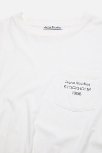 Long-sleeve crewneck T-shirt is crafted from irregular jersey. Piece-dyed with vintage spray and finished with distressed ribbing at the neckline, cuffs, and hem. Made from organically grown cotton, each piece develops a unique appearance. Features the Acne Studios 1996 logo print on the chest pocket. Cut to a relaxed unisex fit and hip length. - Relaxed unisex fit - Hip length - Sprayed finish - Logo on chest pocket - Distressed neckline, cuffs and hem - The female model is 177 cm / 5’8 and wears a size XS - The male model is 188 cm / 6′2 and wears a size M - Style ID:FN-UX-TSHI000284 - Made from organically grown cotton - Shell: 85% Cotton, 15% True hemp