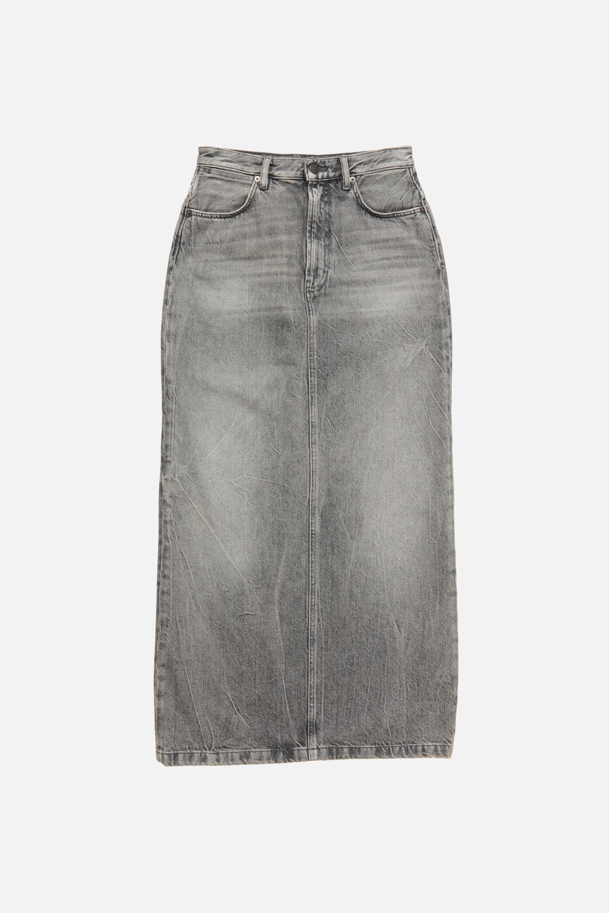 Long denim skirt features a mid-tone eco wash with rags and tied effects on loose black denim. Every garment will differ. Cut to a regular fit, it has a high waist, ankle length, straight shape, and zipper fly closure. - Long denim skirt - Straight shape - Regular fit - High waist - Ankle length - Zipper fly closure - Model is 179 cm / 5'9 and wears a size 36 - Style ID: FN-WN-SKIR000907 - Made with organically grown cotton - Shell: 82% Cotton, 18% Lyocell, Patch: 100% Cow leather