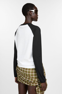 Crew neck long sleeve t-shirt is crafted lightweight jersey cotton blend. Detailed with a small bow logo at the chest. Cut to a regular unisex fit and hip length. - Regular unisex fit - Long sleeve - Hip length - Bow logo - Female model is 178 cm / 5'10 and wears a size S - Male model is 187 cm / 6'1 and wears a size M - Style ID: FN-UX-TSHI000094 - Made with organically grown cotton. - Shell: 80% Cotton, 20% Lyocell