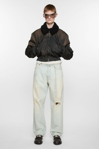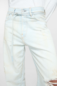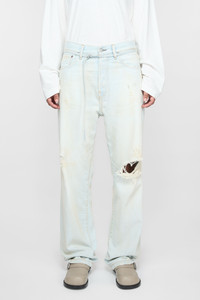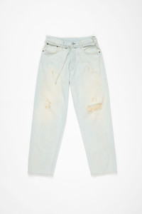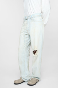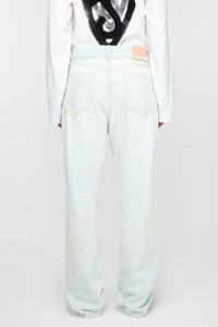 1991 jeans are cut to a loose unisex fit with a low to mid-waist, matching thin belt, straight leg and regular length. Adorned with coated finished and distressed details. made of rigid denim in light blue/white wash. - Loose fit - Low to mid waist - Straight leg - Regular length - Thin belt - Distressed details - 5-pocket construction - Back leather logo patch - Button fly - Female model is 179cm/ 5'11" and wears a size 29/34 - Male model is 185cm/ 6'1" and wears a size 29/34 - Style ID: Style ID: Acne Studios 1991 Toj U Shorebreak - Shell: 100% Cotton, Patch: 100% Cow leather