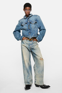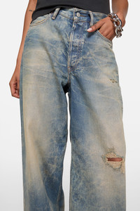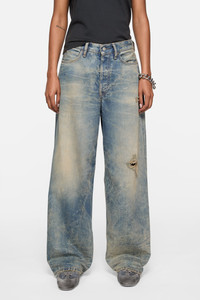 Jeans feature irregular bleach marks on a vintage-inspired, textured denim base with mineral dye and worn-in detailing, making each pair unique. 1981 jeans are cut to a loose fit with a low/mid waist, long length, wide baggy leg, and a button fly. - Loose fit - Low/mid waist - Long length - Wide baggy leg - 5-pocket construction - Button fly - Female model is 177 cm / 5'8 and wears Small/Regular: size 36, denim 27 waist/32–34 length. - Style ID: Acne Studios 1981 U Goldmine - Made with organically grown cotton and recycled cotton - Shell: 100% Cotton, Patch: 100% Cow leather