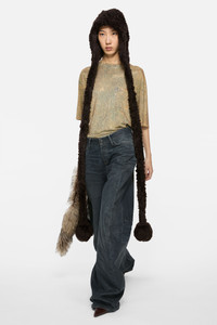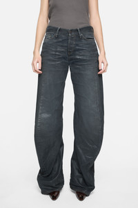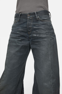 2006 jeans are crafted from dark ring denim with a shiny black coated finish, featuring 3D whiskers and creases. The glossy coating fades toward the waistband to reveal the denim base. Cut to a loose fit with a low waist and wide leg. - 5-pocket denim - Loose fit - Low waist - Wide leg - Long length - Button fly closure - Model is 178 cm / 5'8 and wears a size 27/34 - Style ID: ACNE STUDIOS 2006F GLOSSY - Made with organically grown cotton - Shell: 100% Cotton, Patch: 100% Cow leather