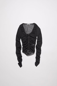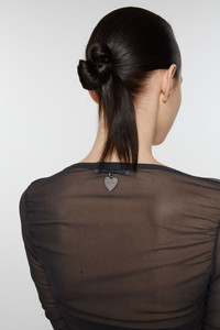 Blouse features a gathered effect with a hook & eye front closure, adorned with a silver-toned branded charm at the back of the neckline. Crafted from a lightweight mesh with a soft finish and bi-stretch structure. Cut to a fitted silhouette. - Fitted fit - Waist length - Gathered details - Hook & eye closure - Branded Heart-shape charm at the back neckline - Sheer fabric - Model is 180cm/ 5'11 and wears a size 36 - Style ID: FN-WN-BLOU001095 - Shell: 100% Nylon