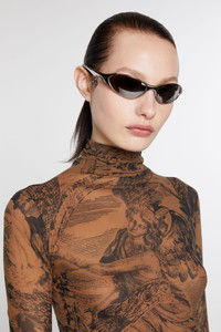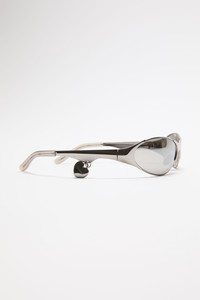 Sunglasses feature a sleek oval shield silhouette characterised by silver-toned steel frames adorned with a heart charm branded with an Acne Studios engraving. - Charm with Acne Studios logo engraved - Stainless steel frame - Height of the temple: 125 mm - Width of the lenses: 60 mm - Height of the lenses: 34.5 mm - Style ID: FN-UX-EYEW000067 - Lens: 100% Nylon, Frame: 50% Monel, 50% Niclafor