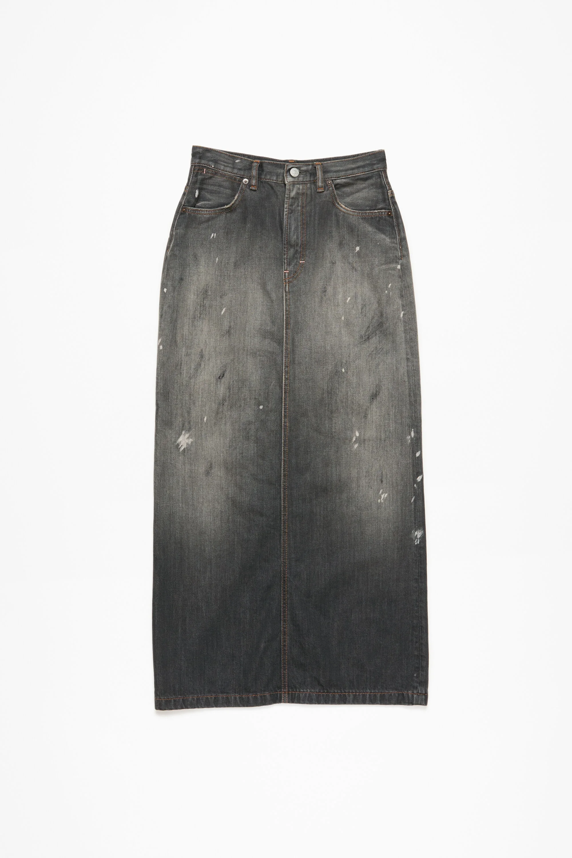 Denim skirt features a 5-pocket construction with a centre back slit. Crafted in non-stretch denim in a dark wash with tinted and painted mark detailings. Cut to a regular fit with a mid-waist and long length. - Regular fit - Mid waist - Long length - Zip fly - Model is 180 cm / 5′11 and wears a size 27 - Style ID: FN-WN-SKIR000843 - Made from organically grown cotton. - Shell: 100% Cotton, Patch: 100% Cow leather