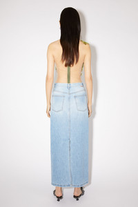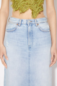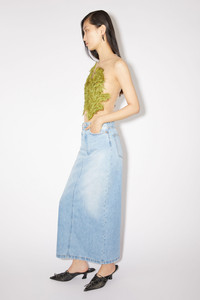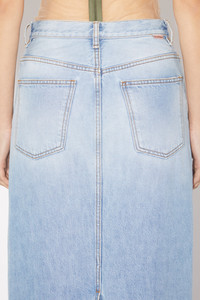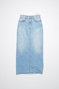 Acne Studios light blue denim skirt features a 5-pocket construction with a centre back slit. Cut to a regular fit with a mid-waist and long length. - Regular fit - Mid waist - Long length - Zip fly - Model is 180 cm / 5′11 and wears a size 27 - Style ID: FN-WN-SKIR000557 - Made from organically grown cotton. - Shell: 100% Cotton