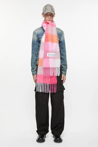 Checked scarf is made of a soft mohair blend with fringed ends. Detailed with an Acne Studios embroidered logo. Crafted from carefully selected material known for its soft and hairy fibres. - Check - Logo patch - Fringed ends - Measurements including fringe: 250 cm length; 28 cm width - Fringe measurements: 12 cm approx. - Made in Italy - Style ID: FN-UX-SCAR000115 - Due to the characteristics of the material, it is natural for small fibres to shed over time. Handle with care to preserve the original appearance as long as possible. - Shell: 33% Alpaca, 25% Wool, 22% Nylon, 20% Responsible mohair