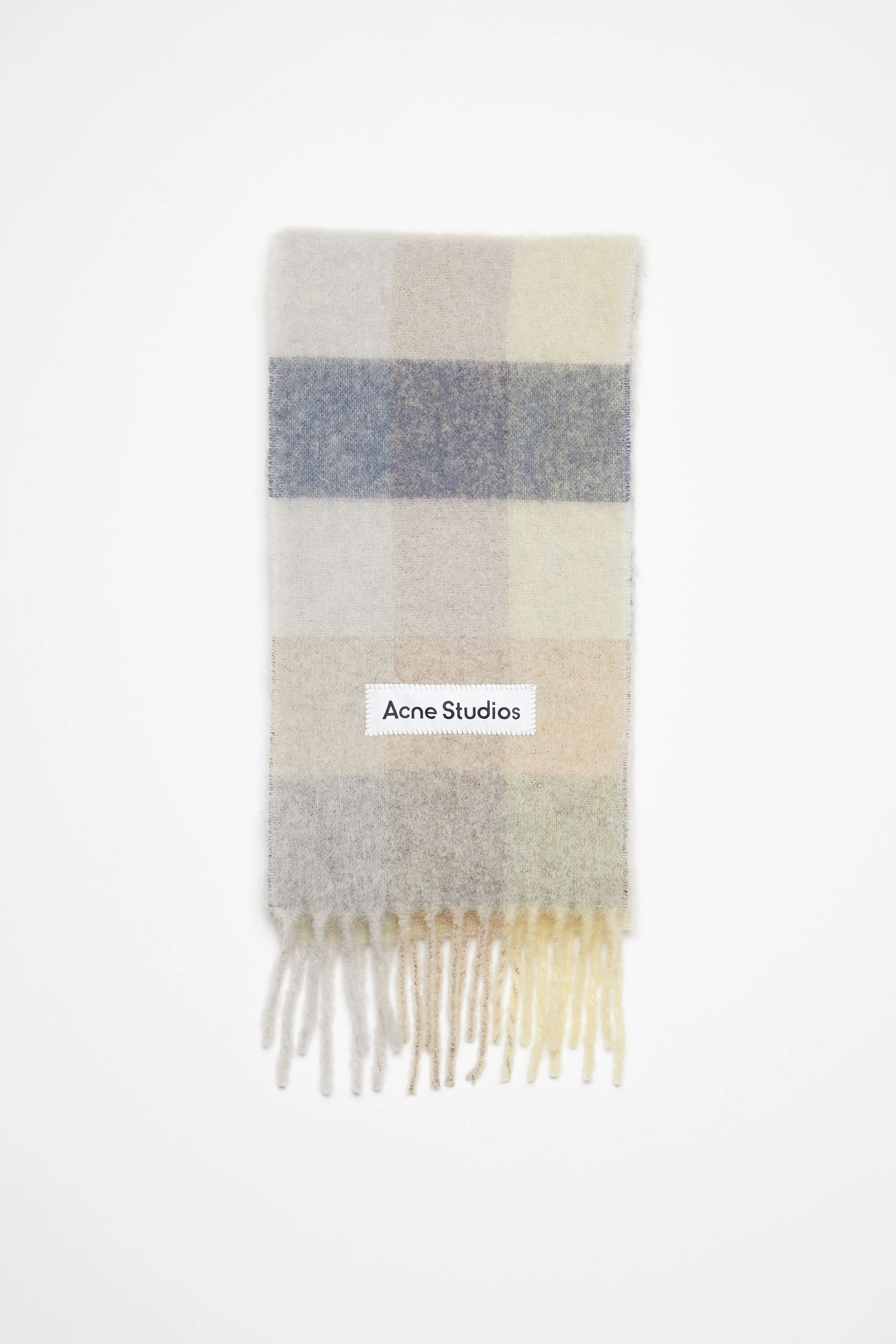 Checked scarf is made of a soft mohair blend with fringed ends. Detailed with an Acne Studios embroidered logo. Crafted from carefully selected material known for its soft and hairy fibres. - Check - Logo patch - Fringed ends - Measurements including fringe: 250 cm length; 28 cm width - Fringe measurements: 12 cm approx. - Made in Italy - Style ID: FN-UX-SCAR000115 - Due to the characteristics of the material, it is natural for small fibres to shed over time. Handle with care to preserve the original appearance as long as possible. - Shell: 33% Alpaca, 25% Wool, 22% Nylon, 20% Responsible mohair