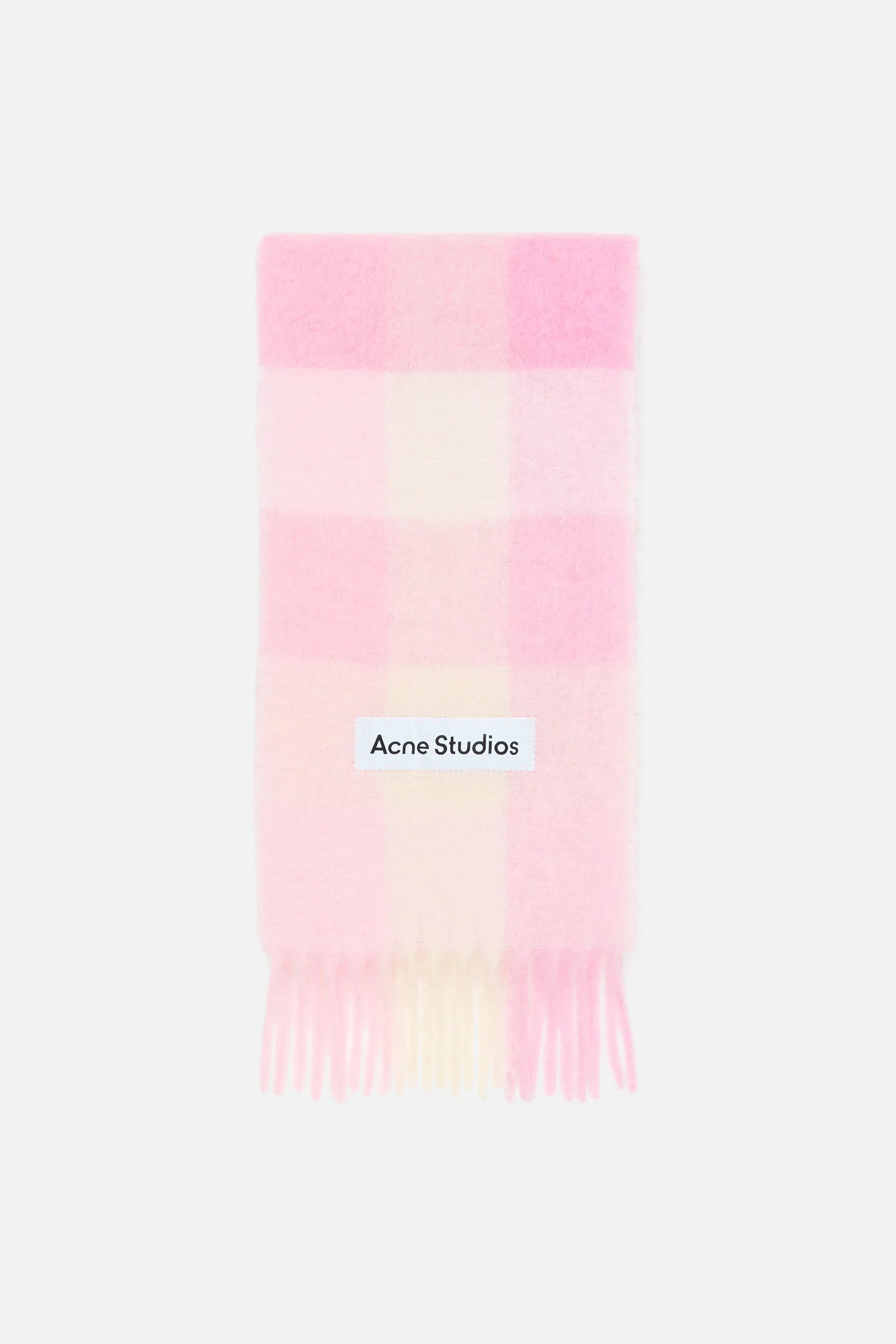 Checked scarf is made of a soft mohair blend with fringed ends. Detailed with an Acne Studios embroidered logo. Crafted from carefully selected material known for its soft and hairy fibres. - Check - Logo patch - Fringed ends - Measurements including fringe: 250 cm length; 28 cm width - Fringe measurements: 12 cm approx. - Made in Italy - Style ID: FN-UX-SCAR000115 - Due to the characteristics of the material, it is natural for small fibres to shed over time. Handle with care to preserve the original appearance as long as possible. - Shell: 33% Alpaca, 25% Wool, 22% Nylon, 20% Mohair