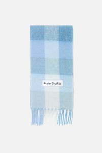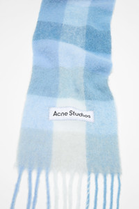Checked scarf is made of a soft mohair blend with fringed ends. Detailed with an Acne Studios embroidered logo. Crafted from carefully selected material known for its soft and hairy fibres. - Check - Logo patch - Fringed ends - Measurements including fringe: 250 cm length; 28 cm width - Fringe measurements: 12 cm approx. - Made in Italy - Style ID: FN-UX-SCAR000115 - Due to the characteristics of the material, it is natural for small fibres to shed over time. Handle with care to preserve the original appearance as long as possible. - Shell: 33% Alpaca, 25% Wool, 22% Nylon, 20% Mohair