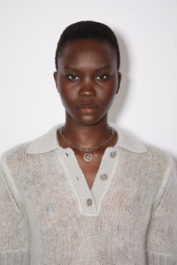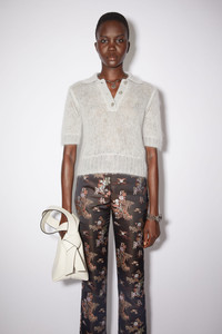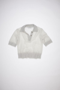 Acne Studios pale grey short sleeve polo shirt is made of a fuzzy mohair blend with a sheer quality and button closures. - Ribbed collar, button placket, cuffs, and hem - Centre front button closures - Fully fashioned details - Sheer, double-layered open knit jersey - Soft mohair blend - Style ID: FN-WN-KNIT000459 - Regular fit - European sizing - Model is 178cm/ 5'8" and wears a size S - Main material: 55% mohair, 30% nylon, 15% wool