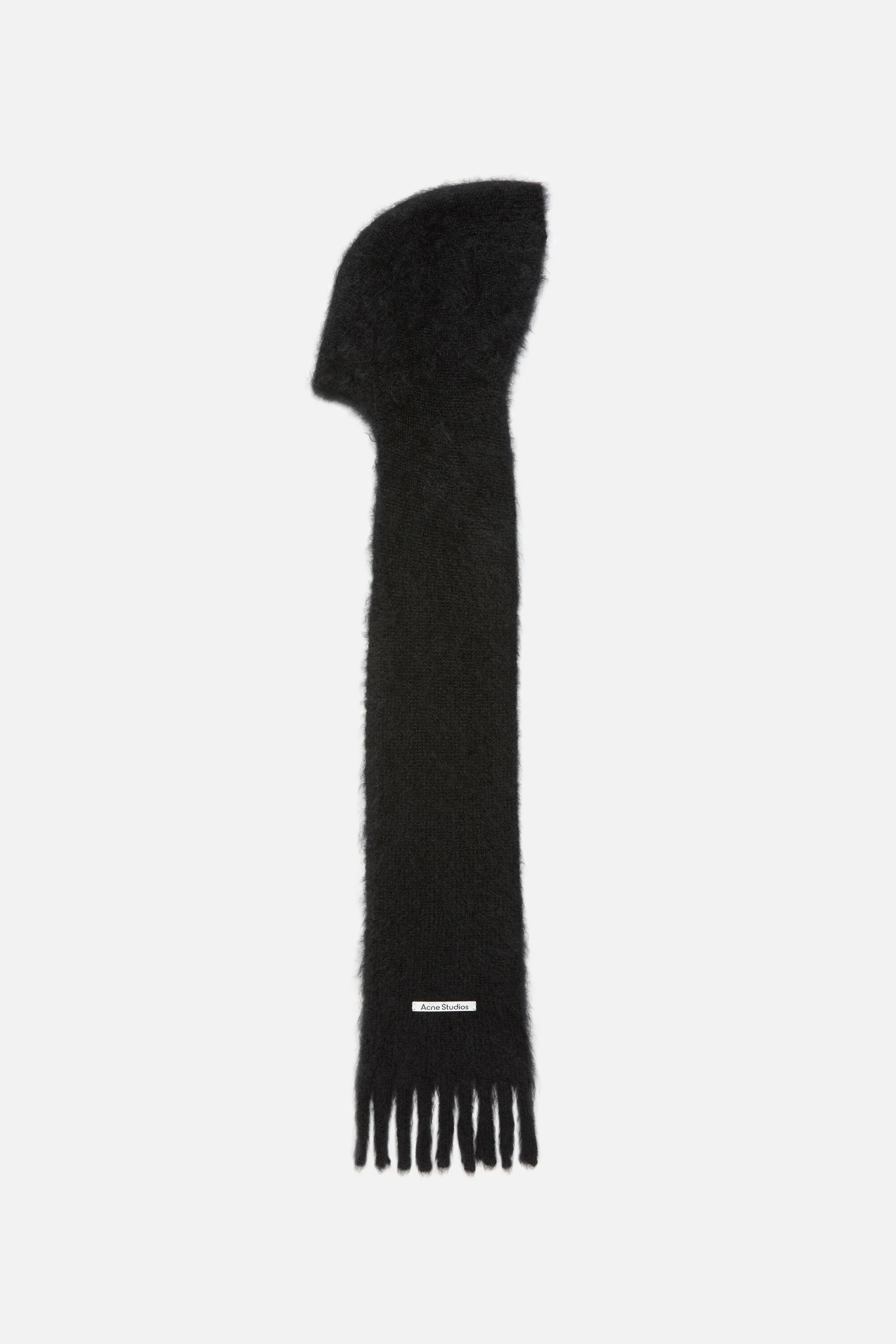 Hooded scarf crafted from a soft mohair blend, featuring fringed ends and an Acne Studios logo label. - Hooded scarf - Fringed ends - Acne Studios logo label - Measurements: 124 cm x 20,5 cm - Style ID: FN-UX-ACCS000194 - Shell: 70% Mohair, 30% Wool, Patch: 100% Calf leather